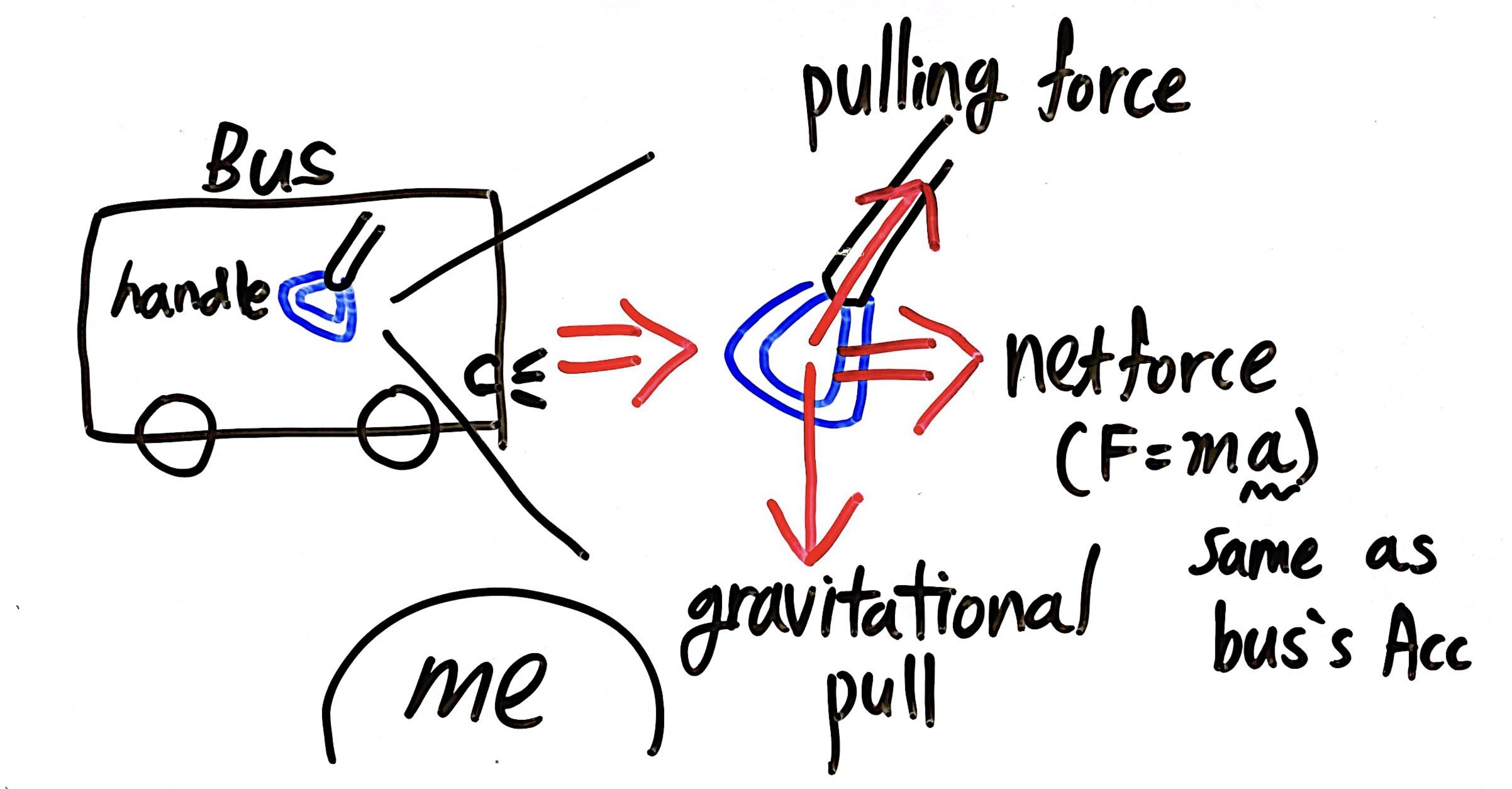 Inside of Bus is remain still. Somebody rolled forward but handles aren't move, they just lean backward. No Move means No Force. Then who removes Pulling's horizontal force?