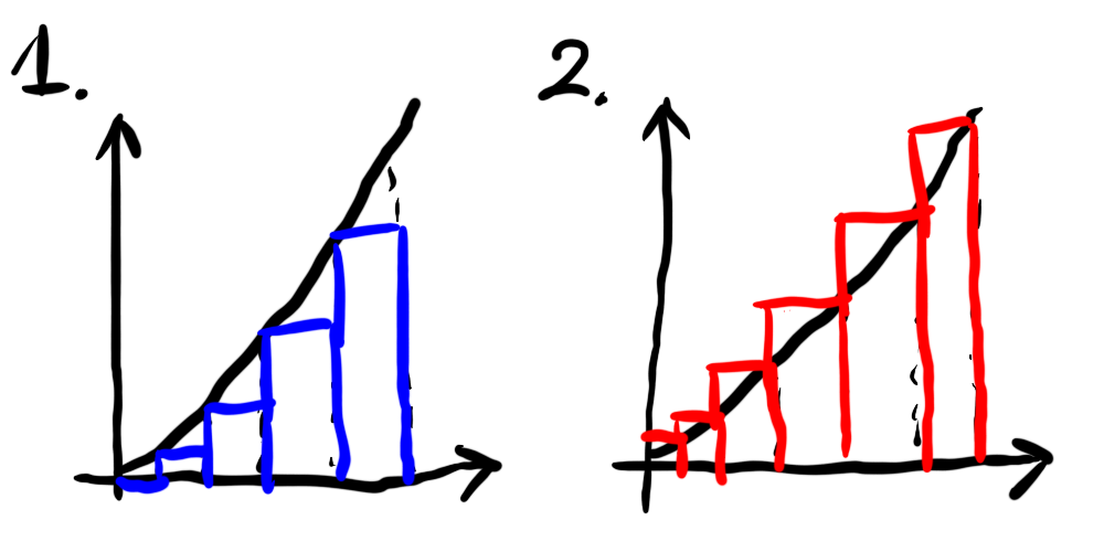 Next choose interval of time which I called Delta_Time(ΔT) and divide whole area with ΔT. Then we have specific moment T0 and T0+ΔT, also value of Velocity F(T0) and F(T0+ΔT). So the problem is which one do you choose for height? Nobody tells you which one is better. It depends on shape of function. Let's me explain the difference.